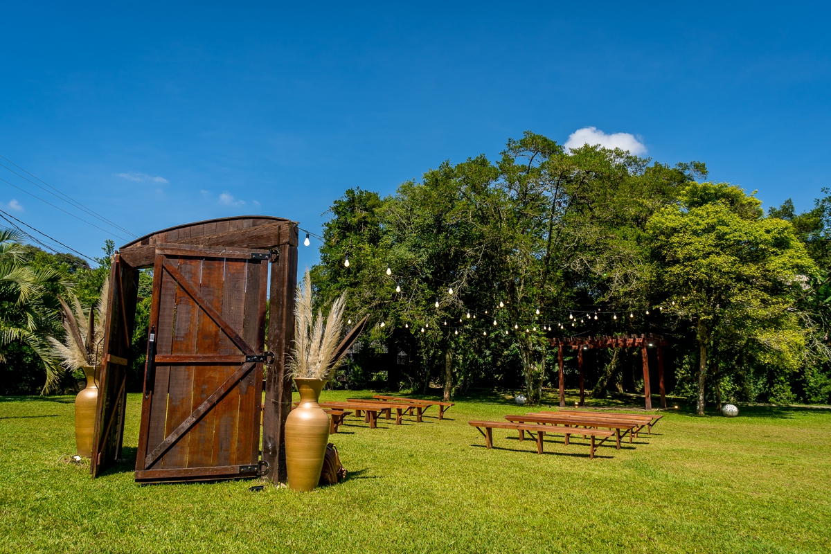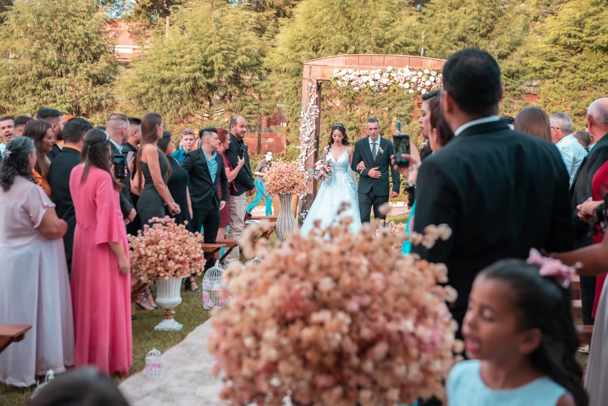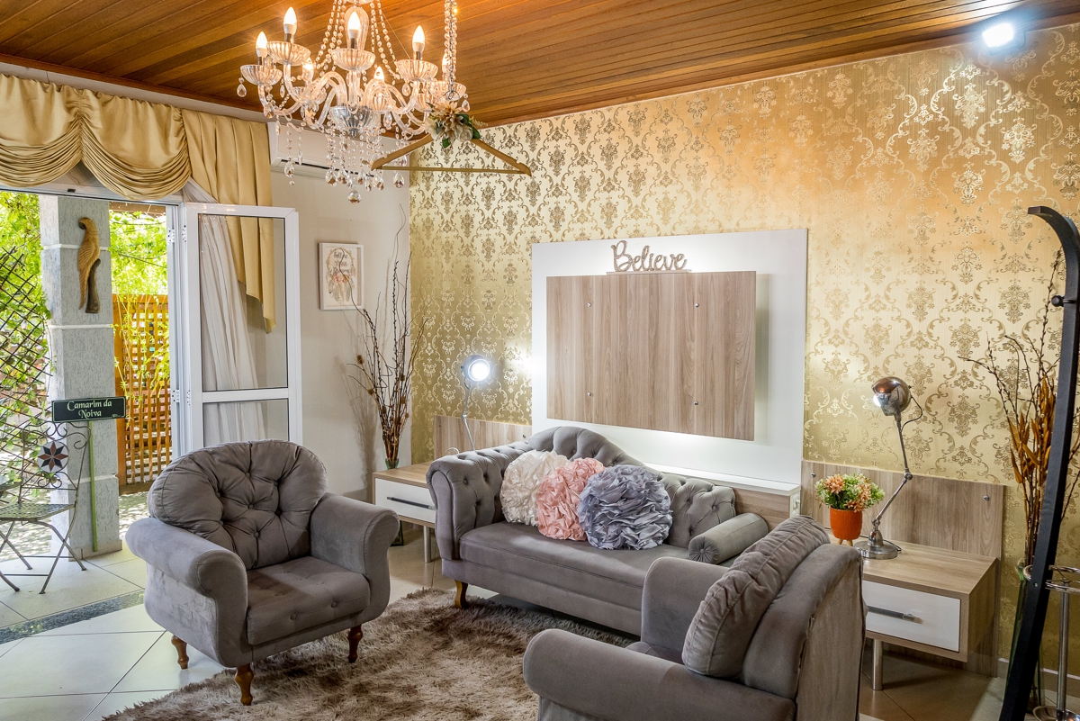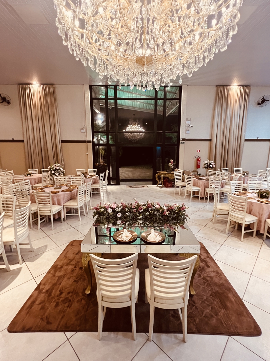 A capacidade do salão de festa é para até 250 convidados, já conta com alguns mobiliários como mesas e cadeiras, mesa decorativa estilo Luis XV, mesas retangulares para apoio do buffet. Já para o casamento ao ar livre também disponibilizamos bancos de madeira, portal de entrada da noiva, pergolado e varal de luzes.